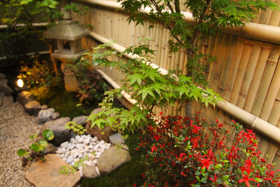 くれない庵自慢の坪庭は、四季折々の花が咲き、季節を思う存分感じることができます。 ひときわ目を引くのが、くれない庵自慢の紅葉。秋の紅葉時期だけでなく、夏の新緑も美しいものです。