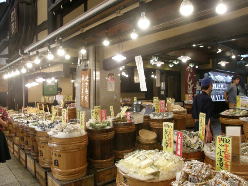 「錦市場」の発祥は古く、江戸時代の初めごろといわれています。現在は寺町通から高倉通までの約390mの区間に126のお店が軒を連ねており、お漬物や野菜、魚といったごく普通の商店街にあるお店だけでなく、 陶器・履き物・和風小物といった雑貨類、刃物のお店に出汁巻卵の専門店、乾物屋、酒屋と京都の食文化を見て味わうのに最適な場所です。