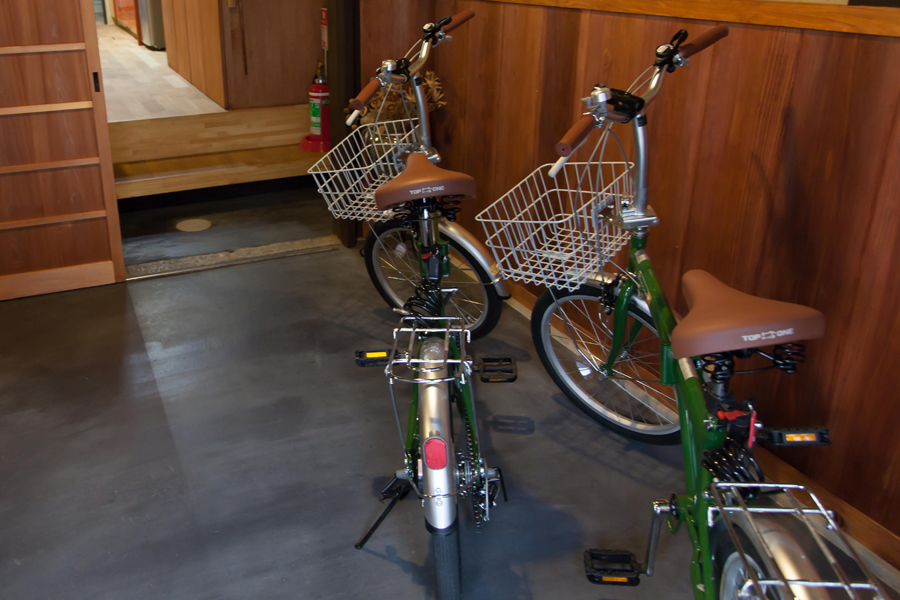 弐の局では無料駐車場・無料の貸し出し自転車を2台ご用意。チェックイン後からチェックアウトの11時までご利用いただけます。
