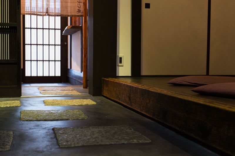 歴史小説で有名な「壬生寺」、いまなお芸妓の最高位である太夫が籍を置く日本唯一のお茶屋を有する「嶋原」。そんな京都の歴史の華やかな舞台に程近い大宮高辻に位置する町家が淳風 しらふじ庵です。 定員8名様と大きなしらふじ庵は、玄関からまっすぐに続く土間が特徴。その土間の突き当たりには、洗面所と浴室があります。