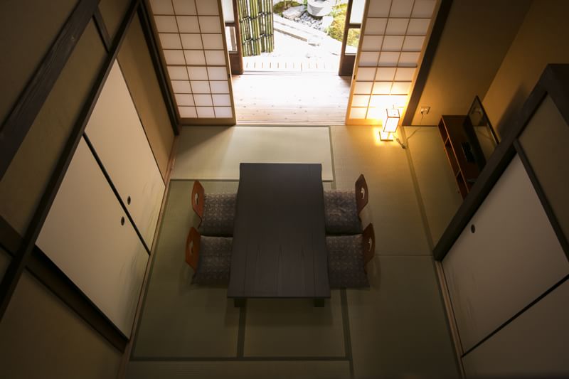 弐の局は平安宮内裏の宿6棟の中で唯一掘りごたつのある宿。座椅子が苦手な方でも快適にお過ごしいただけます。