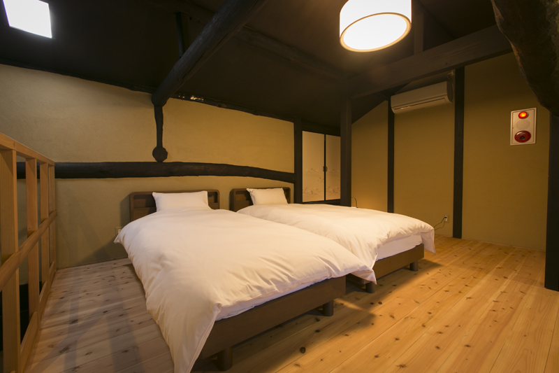 On the ground floor, you can see a wide Japanese room with Horigotatsu style. Even you have some troble to sitting on the floor, you can sit here as same as chair, so this will be very helpful. At the ceiling of upper floor's bedroom, you can see a big beam which remains from old time.