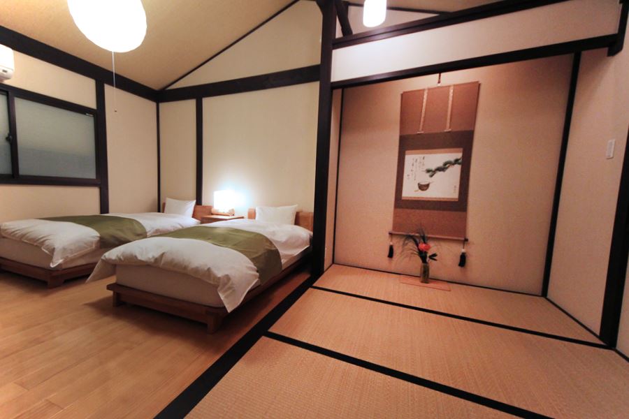 若草庵は定員4名とコンパクトで、ご家族や少人数グループでのご利用に最適。1階には4.5畳の和室、フローリングのフロントスペース、キッチン、浴室、洗面所、トイレ2室を備えています。2階は約11畳の寝室にベッド2台と3畳の畳スペースを設け、和洋の快適さを融合させた空間でお過ごしいただけます。