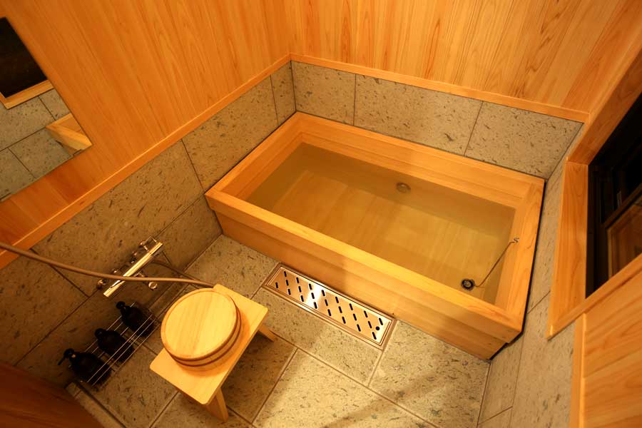 小判型の浴槽は、富士山のひのきで作られたひのき風呂。