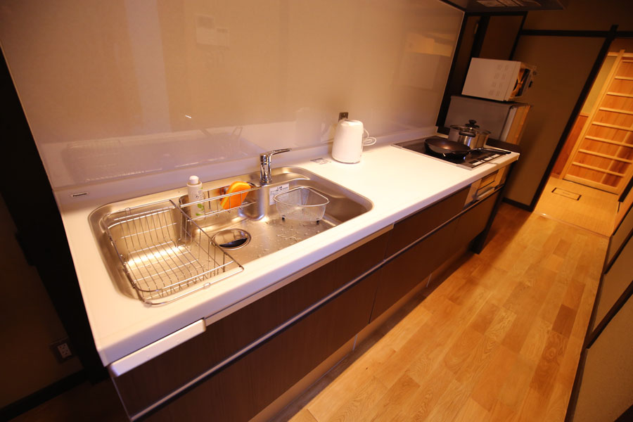 京都で暮らすように過ごすなら、町家での料理を楽しまれてはいかがでしょうか。あんどのキッチンは料理するのに十分なスペースのあるIHシステムキッチン。調理器具や食器類をご用意しています。