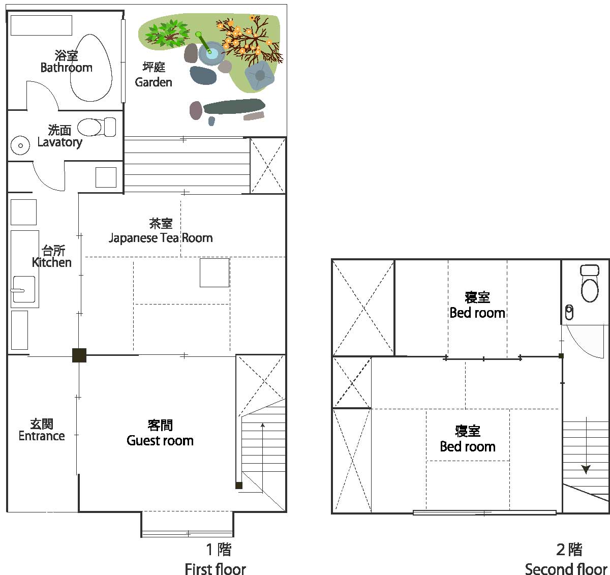 1階には7畳と4.5畳の和室、キッチンスペース、浴室・洗面所を備え、2階にはベッド2台を配した約6畳のフローリング寝室と4.5畳の畳スペースをご用意。トイレは各階に1室ずつあり、グループやご家族での滞在でも安心です。庭にはシンボルツリーの紅葉が植えられ、四季折々の移ろいを楽しめます。