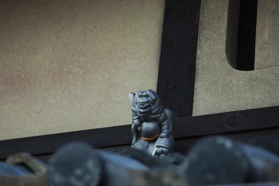 鍾馗(しょうき)さんは中国の故事に倣った厄除けの神様。昔から京町家では中屋根の上に鎮座し、その家の厄を払ってくれています。