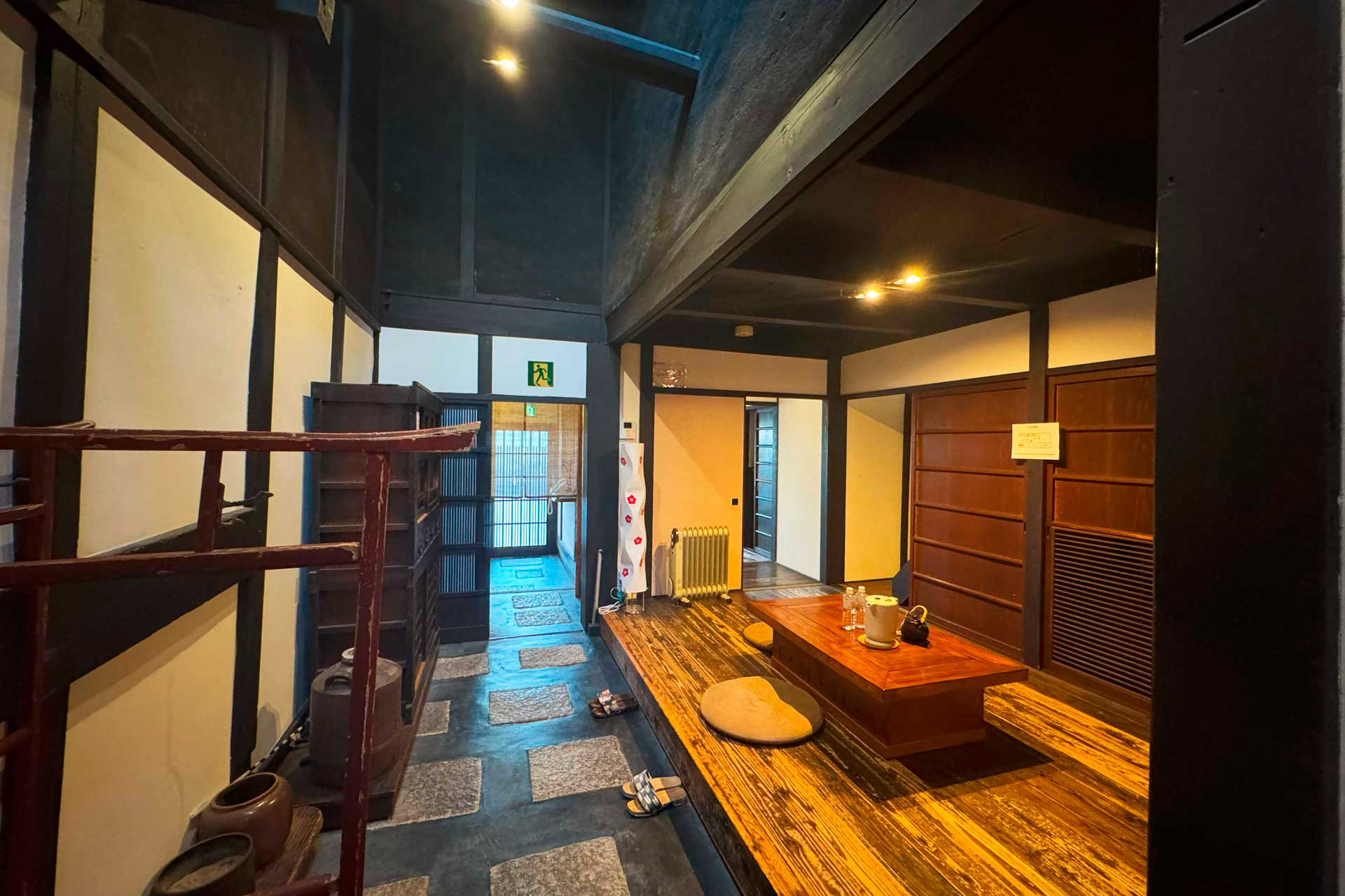 玄関を入ると、大正〜昭和初期の和箪笥や観音様のお面がお出迎え。2畳敷の玄関間で靴を脱ぎ、町家ならではの落ち着いた空気に包まれます。1階には4.5畳の和室が2部屋、檜風呂と天然青石「十和田石」を用いた浴室、洗面脱衣室、キッチン、トイレを完備。枯山水の石庭を眺めながらの入浴は、旅の疲れを癒す特別なひとときです。